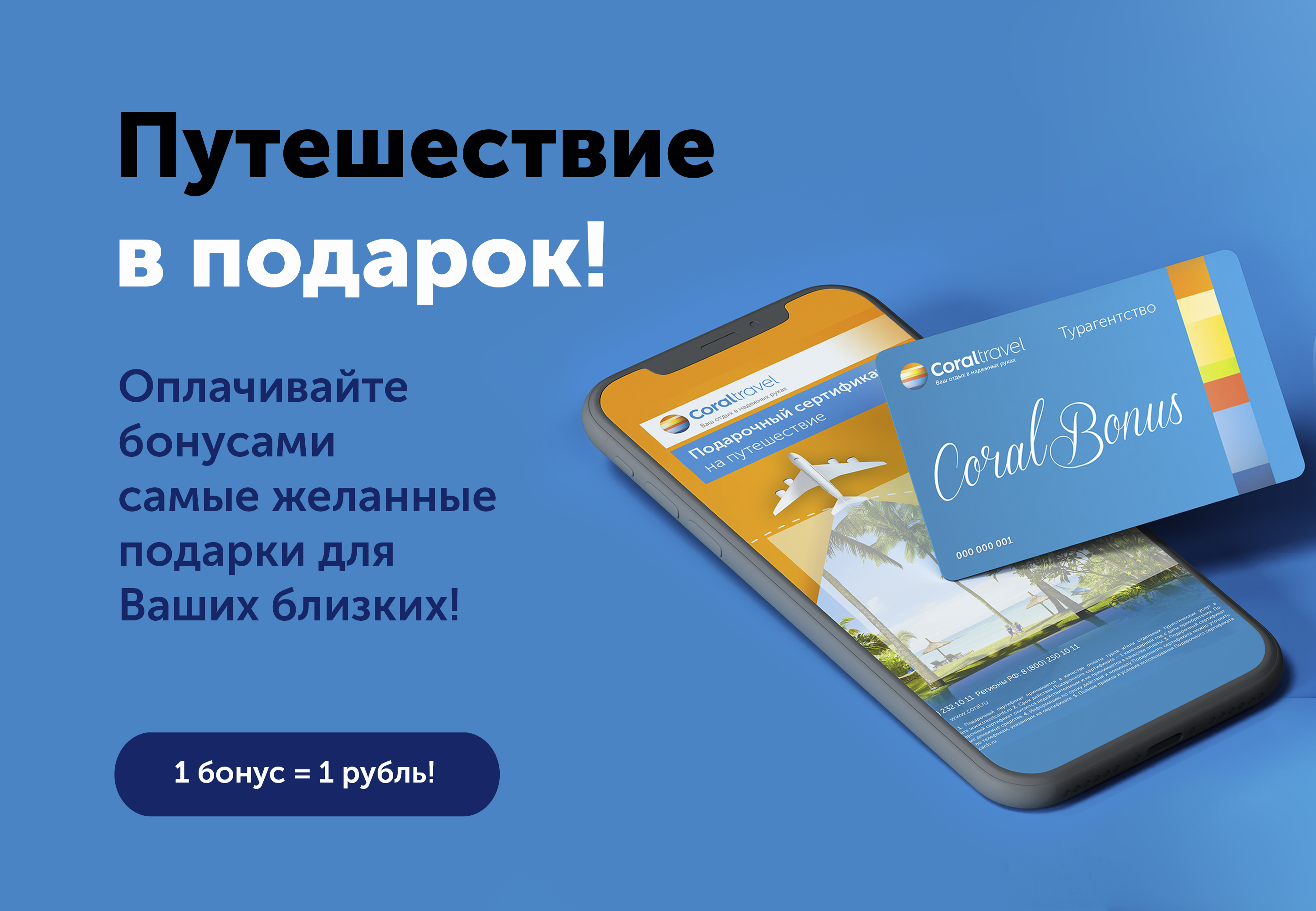 Приобретая электронный подарочный Сертификат на путешествие, указав номер бонусной карты CoralBonus, вы получаете 2% от номинала сертификата бонусными баллами, которые можете использовать на покупку тура и сопутствующих услуг.